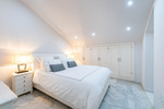 The comfortable master bedroom includes fitted wardrobes and is served by a separate full bathroom. A light-filled staircase leads to the upper level, where a large dressing area connects to two double bedrooms, both offering additional storage, along with another full family bathroom.