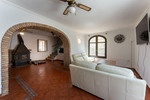 On the ground floor, a large covered terrace welcomes you into the home. From here, you enter a generous family kitchen with a central island. A hallway leads to a double bedroom with built-in wardrobes and a family bathroom with a bathtub. To the left, a spacious living room is divided by a charming central arch, creating both a cozy lounge area and a formal dining space, complete with a large log burner.