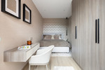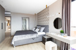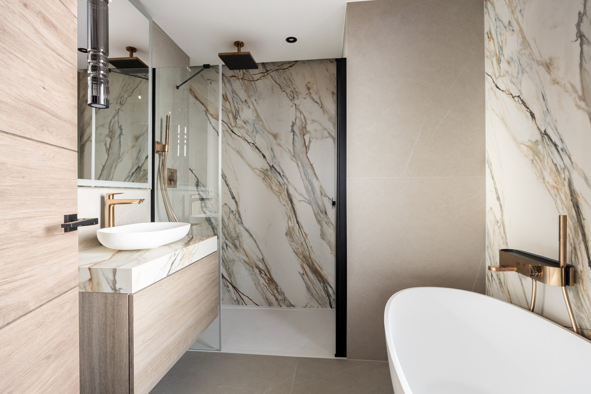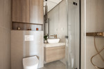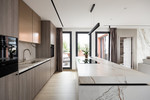 Inside, the 70 m² open-plan living, dining, and kitchen area welcomes abundant natural light, creating an atmosphere of spacious elegance. The home includes three serene bedrooms and three beautifully appointed bathrooms, with the master suite offering a designer freestanding bathtub and wall-mounted rainfall shower. Every detail reflects craftsmanship and harmony: Arklam stone countertops, a statement kitchen island, Miele premium appliances, and a built-in wine cooler complement Austrian-made furniture boards and tailor-made storage solutions. Warm Belgian flooring and Hansgrohe brushed bronze fittings add understated sophistication, while motorised curtain rails and shutters bring effortless comfort.