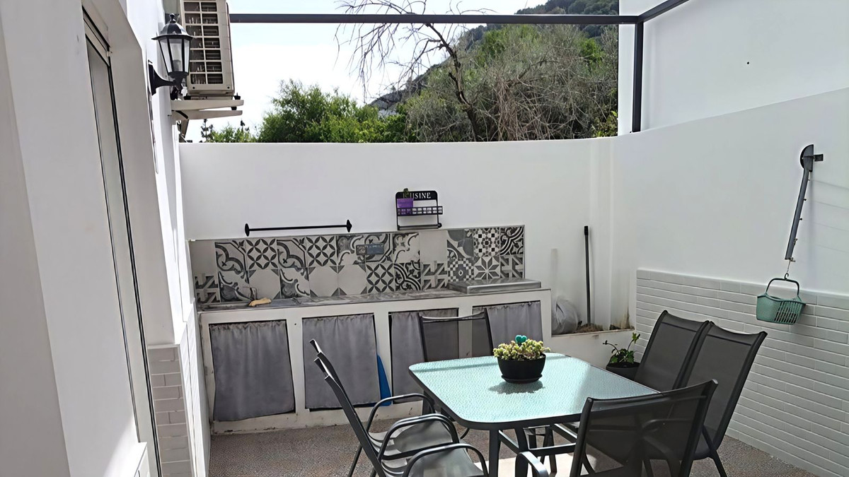 The open-plan living and dining area flows seamlessly into the modern, fully fitted kitchen, creating a bright and welcoming space ideal for both everyday living and entertaining. From the living area, direct access leads to a spacious main terrace. In addition, a door from the kitchen opens onto a covered terrace, which has been cleverly adapted to create a practical utility area.