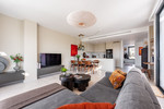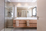 The apartment is distributed over two levels. The ground floor welcomes you with an entrance hall leading into a stylish open-plan living and dining area with a bespoke Ballingslöv kitchen. From here, large sliding doors open onto a spacious terrace with both dining and lounge areas—perfect for outdoor living. Both terraces are equipped with a combination of electric and manual awnings, providing shade and comfort throughout the day.