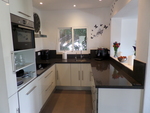 The main level includes a spacious living room, a glazed terrace, a separate fully equipped kitchen, three bedrooms, and two bathrooms. The lower level offers an open plan kitchen/ living and dining area, two bedrooms, a bathroom, an additional guest WC and direct access to the pool area.