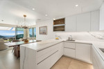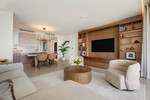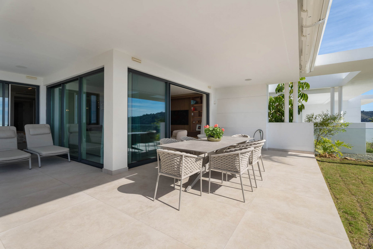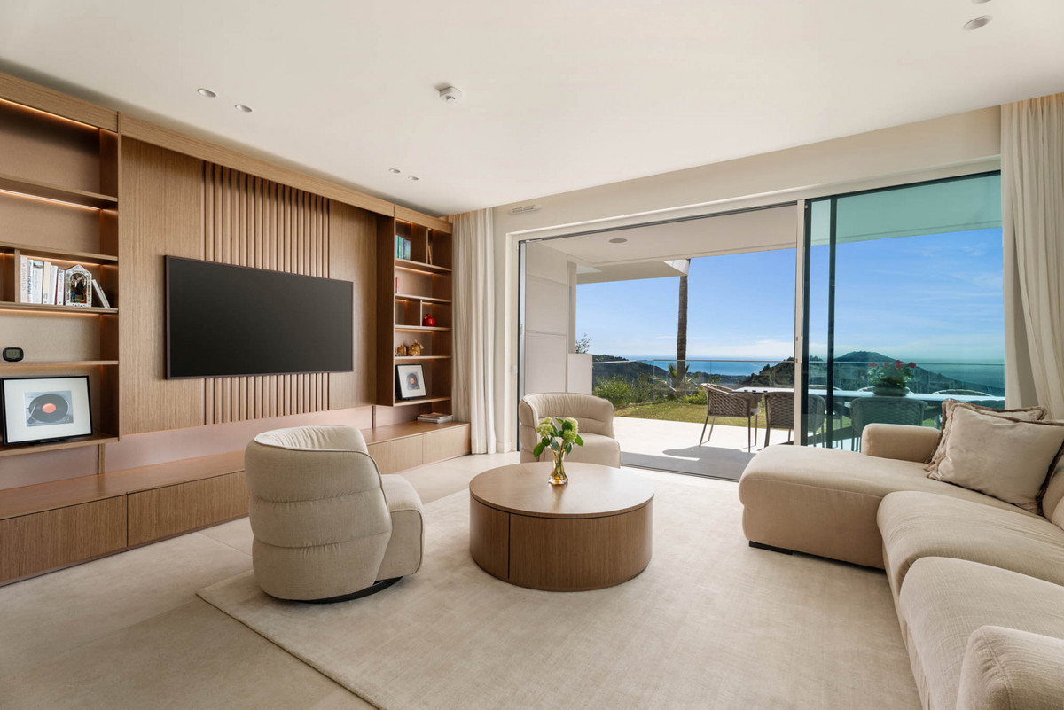 De open woon- en eetkamer staat in directe verbinding met het overdekte terras via kamerhoge schuifdeuren, waardoor een vloeiende overgang tussen binnen- en buitenruimtes ontstaat. Het terras fungeert als een buitenlounge en eethoek, met uitzicht op de privétuin en de mediterrane horizon daarachter. Geïntegreerd geluid in de woonkamer en op het terras versterkt de binnen-buitenbeleving, terwijl de oriëntatie de hele dag door natuurlijk licht binnenlaat en comfort en schaduw behoudt.
