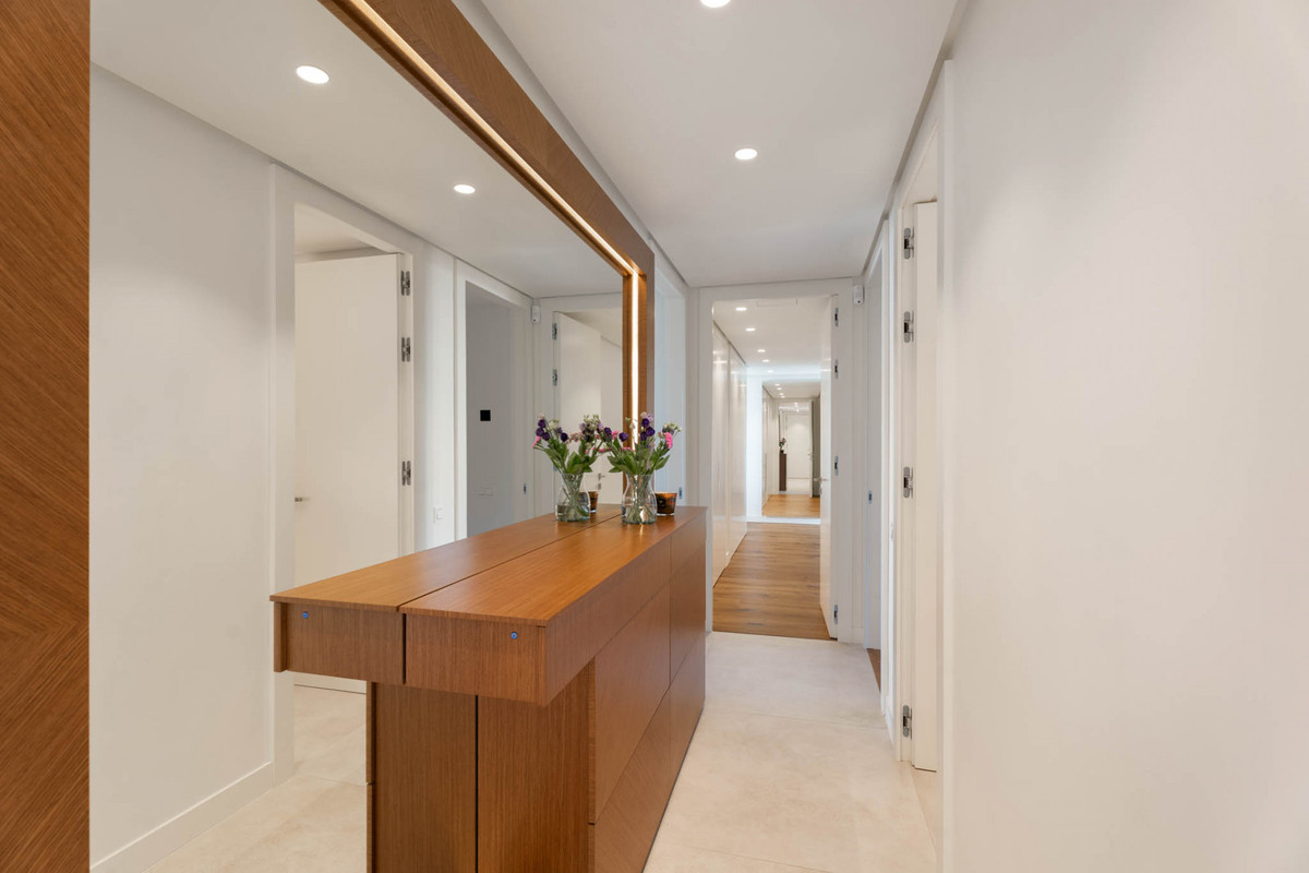De keuken is een volledig uitgeruste designinstallatie van Gunni & Trentino, met hoogwaardige apparatuur en moderne kasten die zijn ontworpen voor zowel het dagelijks leven als voor het ontvangen van gasten. Strakke architectonische lijnen en geïntegreerde afwerkingen versterken de esthetische consistentie van de woning.