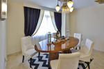 The layout features a grand entrance hall leading to two spacious living rooms with multiple lounging areas, a dedicated dining room, and a fully fitted kitchen. Floor-to-ceiling double-glazed windows invite in natural light and open up to spectacular views of the golf course, lush gardens, and surrounding mountains.