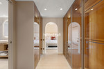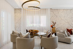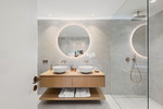 The upper level is dedicated to the impressive master suite, designed as a private sanctuary. It features a walk-in wardrobe, a luxurious en-suite bathroom, and access to its own south-facing terrace. This upper terrace offers both shaded and open-air spaces, a built-in barbecue, and breathtaking views of the Mediterranean Sea and the beautifully landscaped grounds of Torre Bermeja, making it perfect for enjoying the year-round climate of Estepona.