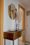 De woning beschikt over een ruime, volledig uitgeruste keuken met een aparte bijkeuken, evenals een lichte en gezellige woon- en eetkamer. Vanuit hier heeft u toegang tot een ruim overdekt terras met westelijke oriëntatie, ideaal om te genieten van de middagzon en zonsondergangen. Het terras is voorzien van volledig opvouwbare glazen gordijnen, waardoor het het hele jaar door gebruikt kan worden, met mooie uitzichten op de gemeenschappelijke tuinen, het omliggende landschap en de zee.