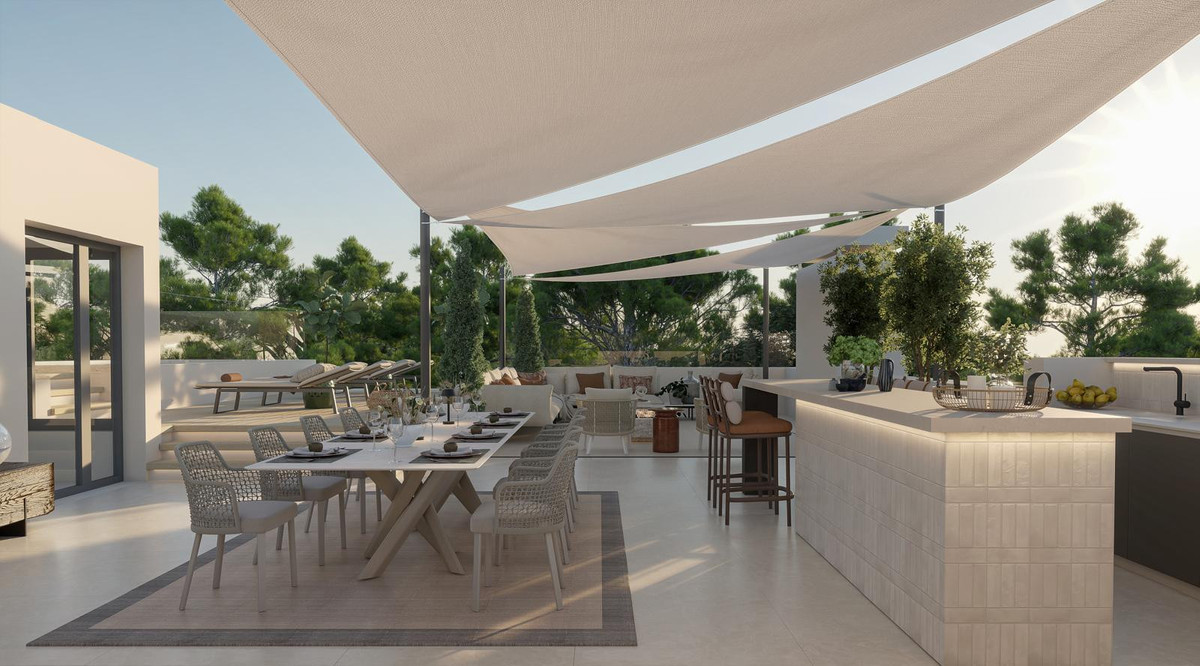 This remarkable property also includes an exclusive bar and entertainment room, a fully equipped gym, a Turkish bath, and an indoor pool, creating a private wellness and leisure sanctuary. Set on a generous plot, the villa offers extensive outdoor areas designed to enjoy the Mediterranean lifestyle, including multiple seating areas, a private swimming pool, and breathtaking sea views. The impressive solarium features an outdoor kitchenette and additional space for relaxation and entertainment.