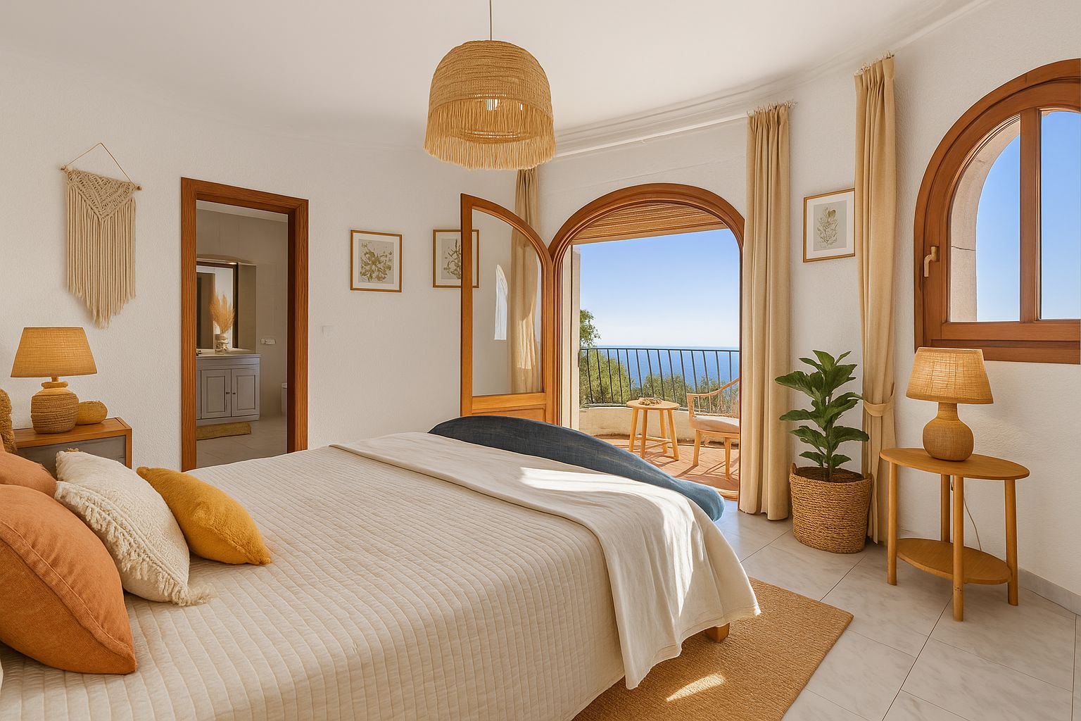 Op de bovenste verdieping vinden we de master suite, met een grote en-suite badkamer en toegang tot een eigen terras met spectaculair uitzicht.