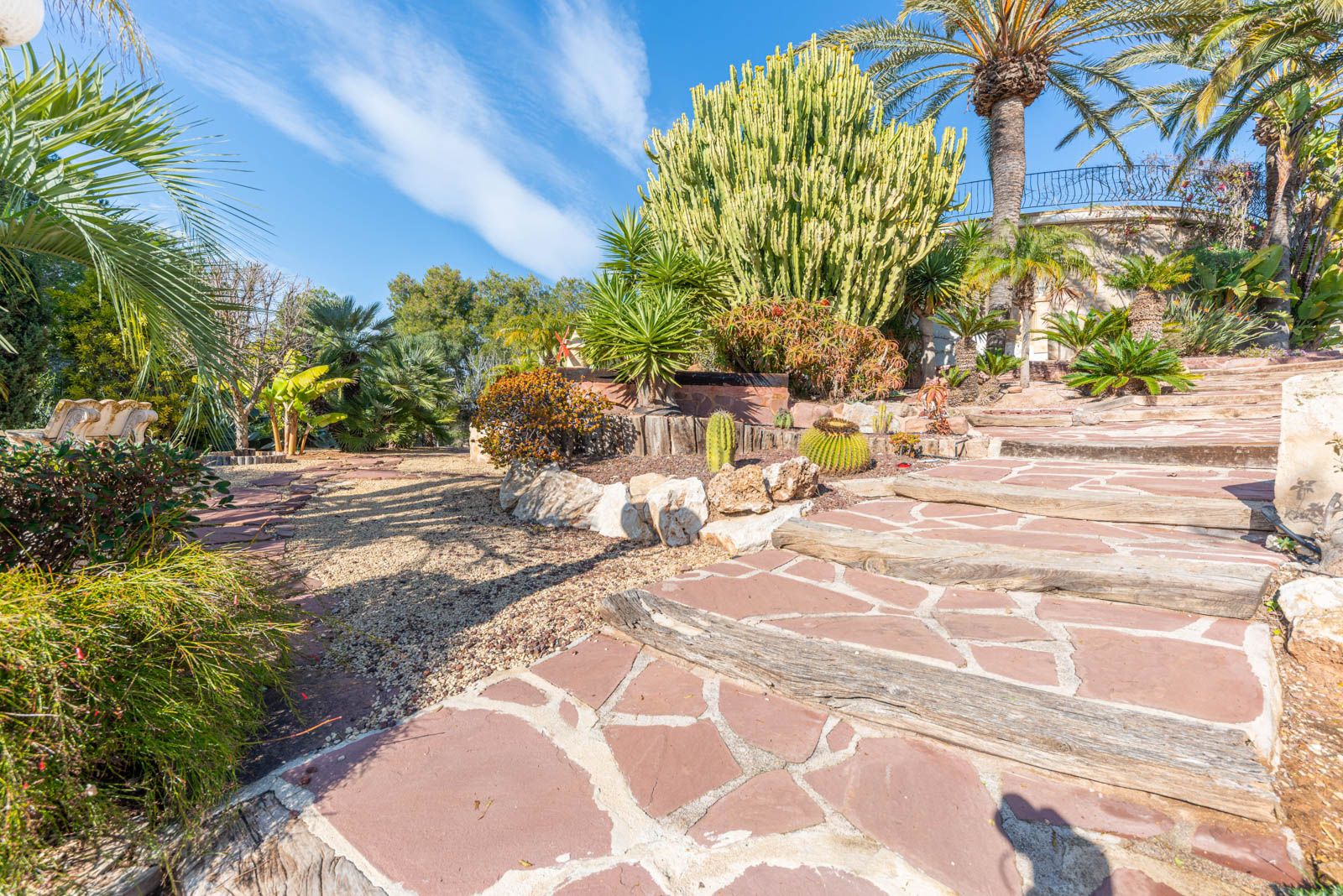 Buiten vinden we een enorm privézwembad met een kindergedeelte, evenals prachtige inheemse tuinen met meerdere terrassen en een vijver. We vinden ook een pergola voor twee auto’s en een garage.